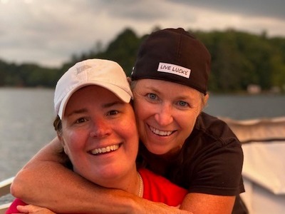 Jody (left) and her wife, Michelle, on their pontoon boat at their cabin